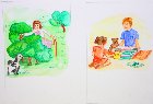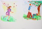 | Children will have fun writing stories about catching butterflies in an open green meadow. The second Primary Book Page illustrates picking apples on a warm summer afternoon. The questions are, who is catching butterflies? Who is picking apples? |